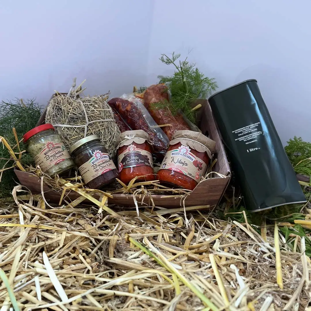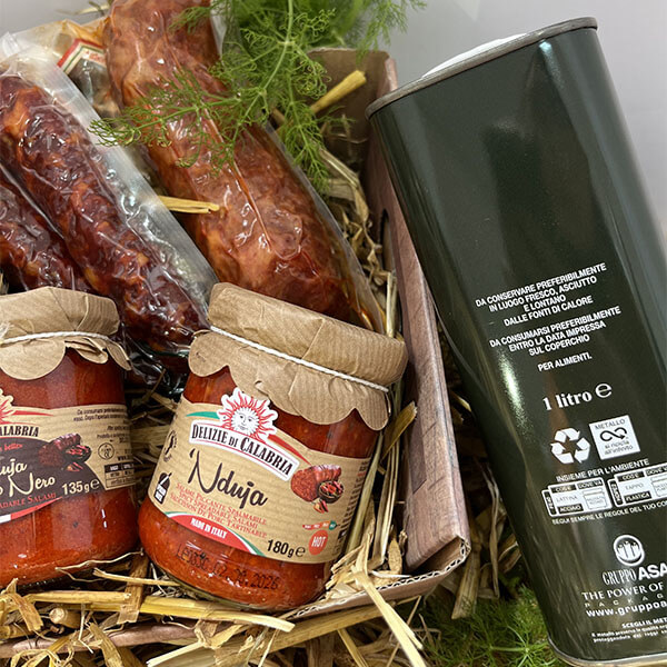 La box “Atomika” è una selezione esplosiva di sapori autentici che cattura l’essenza della tradizione italiana. Al suo interno, troverai un litro di olio extra vergine di oliva, perfetto per condire i tuoi piatti. La salsiccia stagionata dolce (250 gr) e la soppressata piccante (300 gr) offrono un equilibrio tra dolcezza e piccantezza. Il formaggio fieno da 750 gr aggiunge un tocco robusto. Completa la box un vasetto di nduja di suino nero (135 gr) e uno di nduja classica (180 gr) per un tocco speziato. Infine, i bruschettoni ai carciofi e alle olive nere portano sapori intensi e genuini al tuo tavolo.