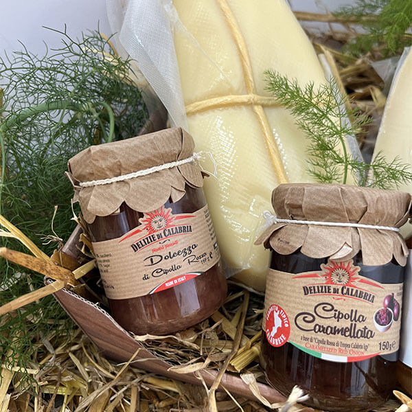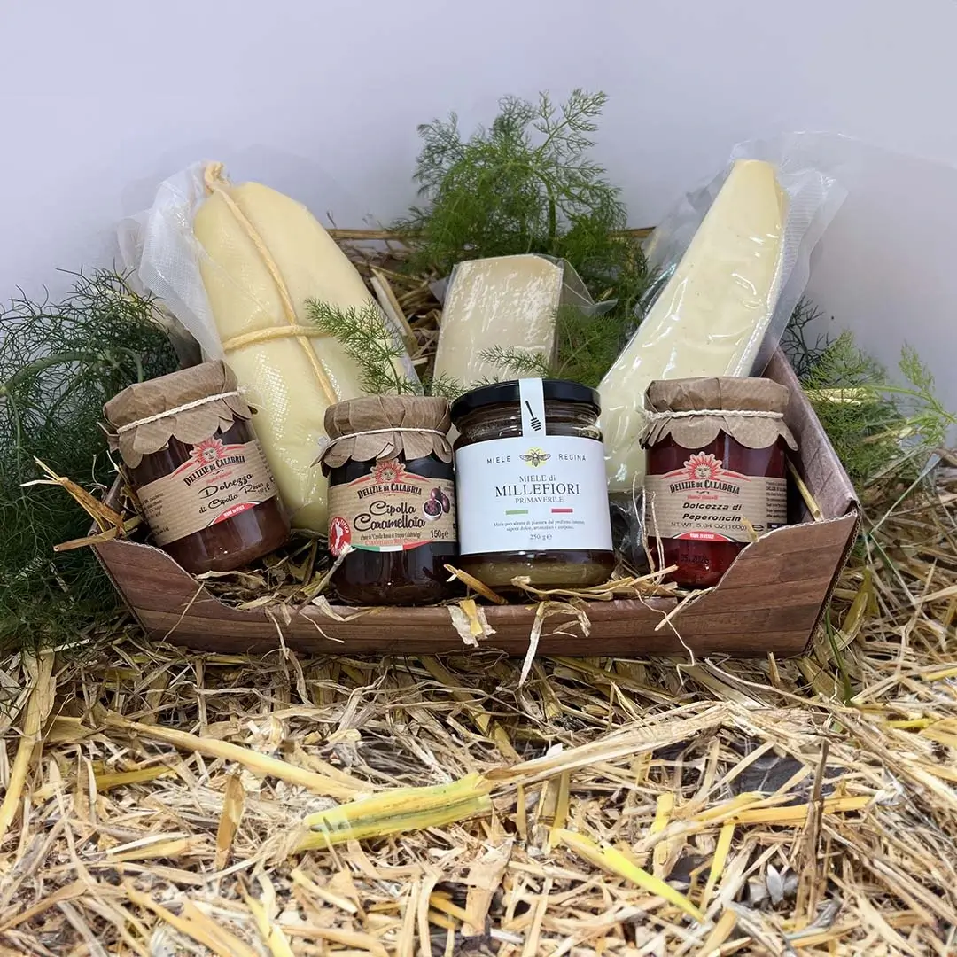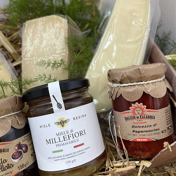 La box “Tropeana” è un viaggio attraverso i sapori tipici della Calabria. Con ½ kg di provola e ½ kg di caciocavallo, troverai formaggi deliziosamente ricchi. A completare questa selezione, un formaggio semi duro misto da 400 gr aggiunge una nota complessa. Assapora la dolcezza del miele millefiori da 250 gr, perfetto con i formaggi. Le cipolle caramellate da 150 gr offrono un tocco di dolcezza e sapore. Esplora la dolcezza piccante della salsa al peperoncino da 160 gr e la dolcezza della cipolla rossa, anch’essa da 160 gr, per un’esperienza di gusto autentica e indimenticabile.